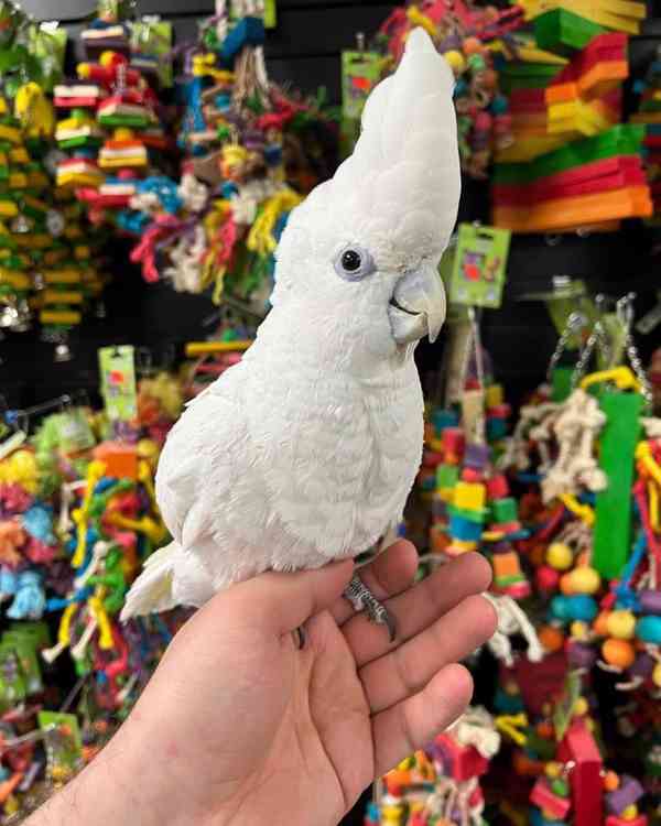Papoušek kakadu - 12 měsíců starý, krmený z ruky, krotký a velmi přátelský. Nekouše, má plné peří a je zdravý. Hrajeme si s nimi a často s nimi komunikujeme, abychom se ujistili, že se jich každý člen rodiny drží v ruce, aby byli dobře vyvážení, což jim usnadňuje přechod do jejich trvalého domova.