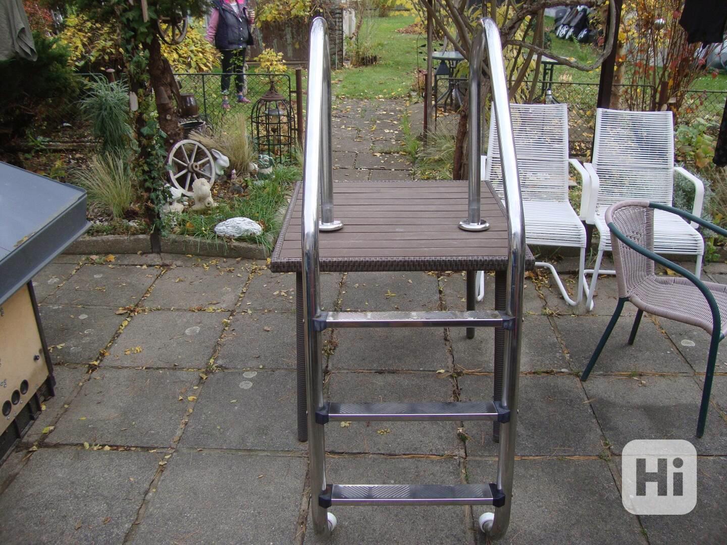 Prodám tyto zachovalé, bazénové schůdky. Důvod prodeje, kupujeme 4. stupňové, tak snad tyto někomu ještě poslouží do bazénu. Pořizovací cena byla 6300 Kč. Jsou nerezové a mají tři stupínky viz foto. Jsou zachovalé, nikde žádná špinavá místa, nebo jiná poškození. Jsou k nim i originální kruhové koncové krytky, gumové dorazy do vody také v pěkném stavu.