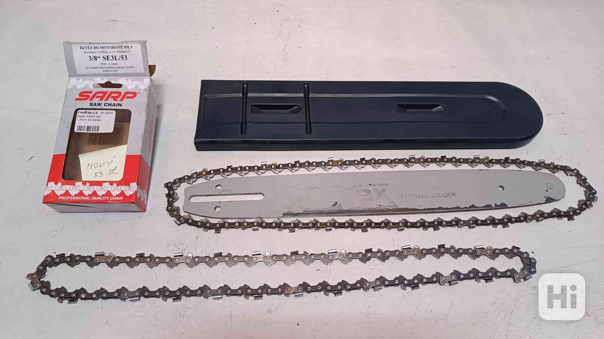 Prodám vodící lištu Narex GB-EPR 350 mm za 190,- Kč, nový řetěz SARP SE3L/53, 1,3 mm, 3/8“, 53 článků za 190,- Kč a stejný řetěz 1 x broušený za 140,- Kč. Vše za 450,- Kč.