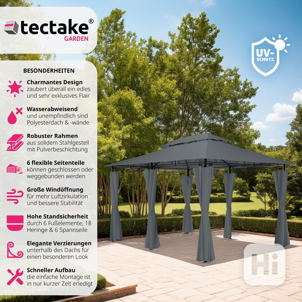 Prodám zahradní altán tectake Luxus‑Gartenpavillon Emine, rozměr 4×3 m, barva světlý antracit (reálná barva je na poslední fotce)